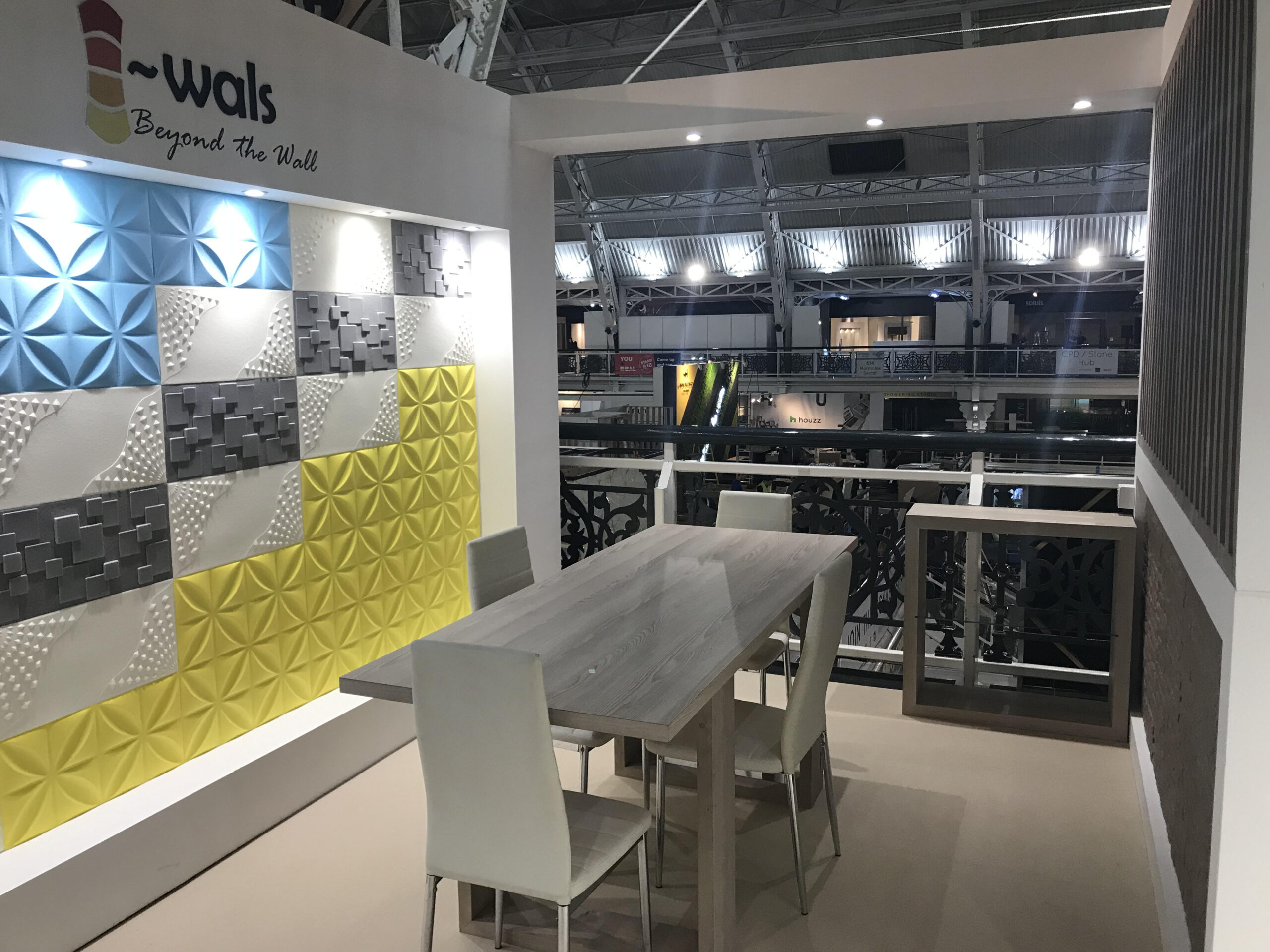 The stand was designed around product discovery. A backlit feature wall displayed a grid of textured panels, using controlled illumination to highlight depth and detail without distracting from the materials themselves.