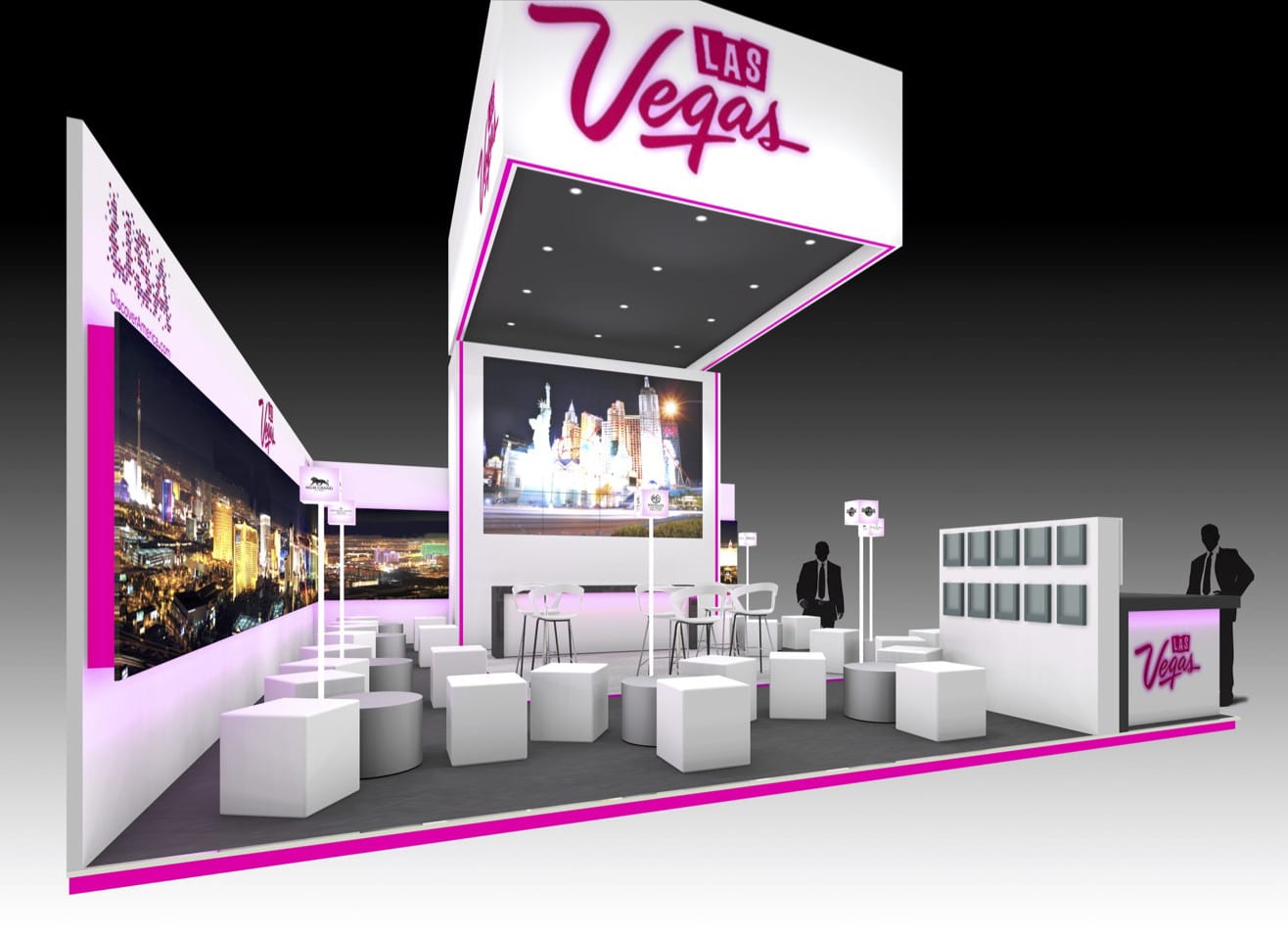 The design focused on scale, visibility, and atmosphere. A striking double height structure with illuminated framing and suspended branding ensured the stand could be seen from across the hall, immediately signalling the Las Vegas identity.