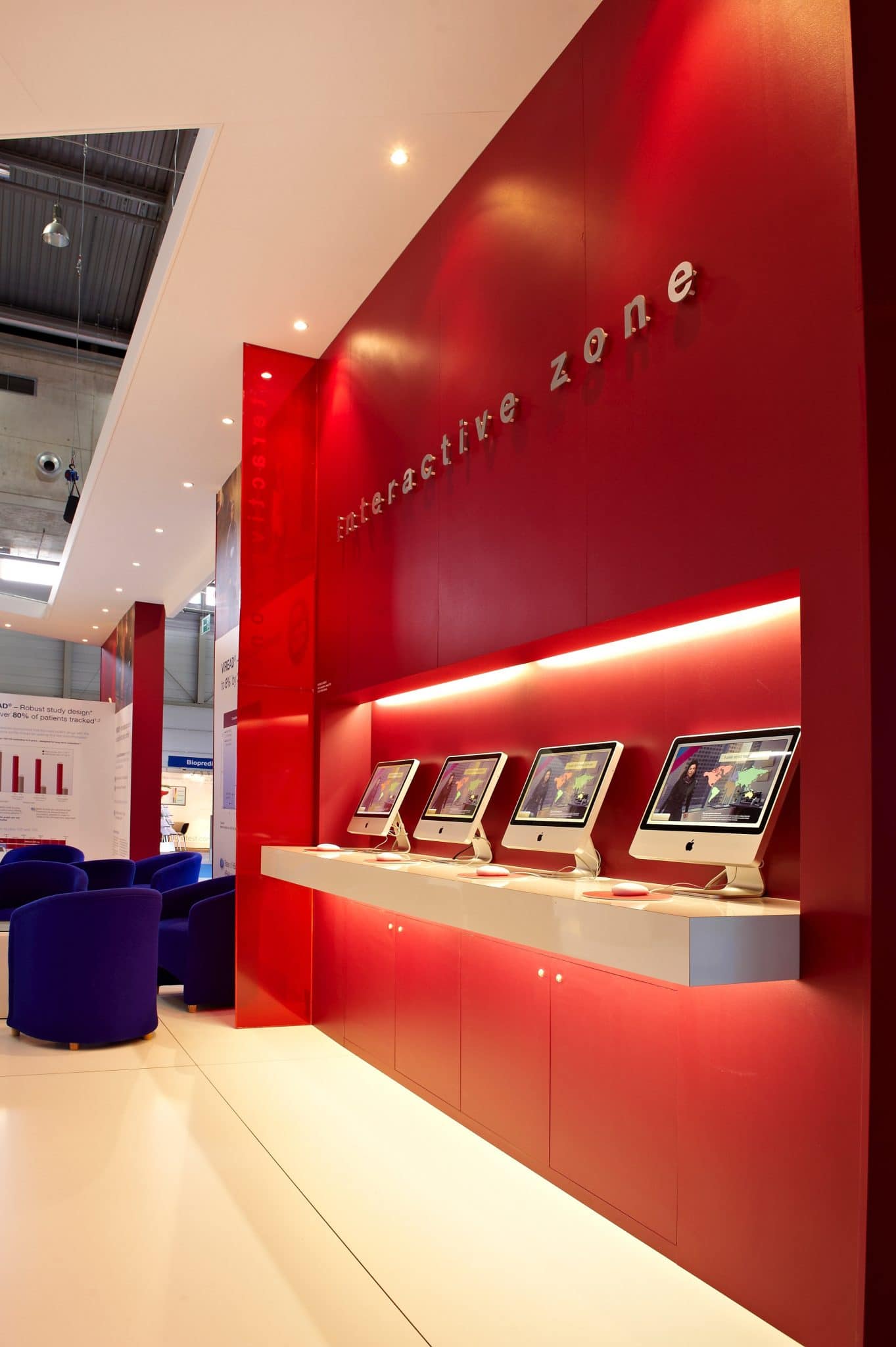 The stand design centred around a bold architectural layout with clear zoning to support different types of engagement. A dedicated interactive zone was created using integrated iMac stations, allowing visitors to explore clinical data and product information at their own pace.